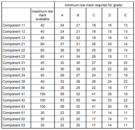 CIE分数线给出的是某一考试系列中,CIE打分的每一份paper或component的最低分数线。表格中也显示了每个option的最低分数线。一个option是获得认可的papers或components组合到一起,构成整个证书。