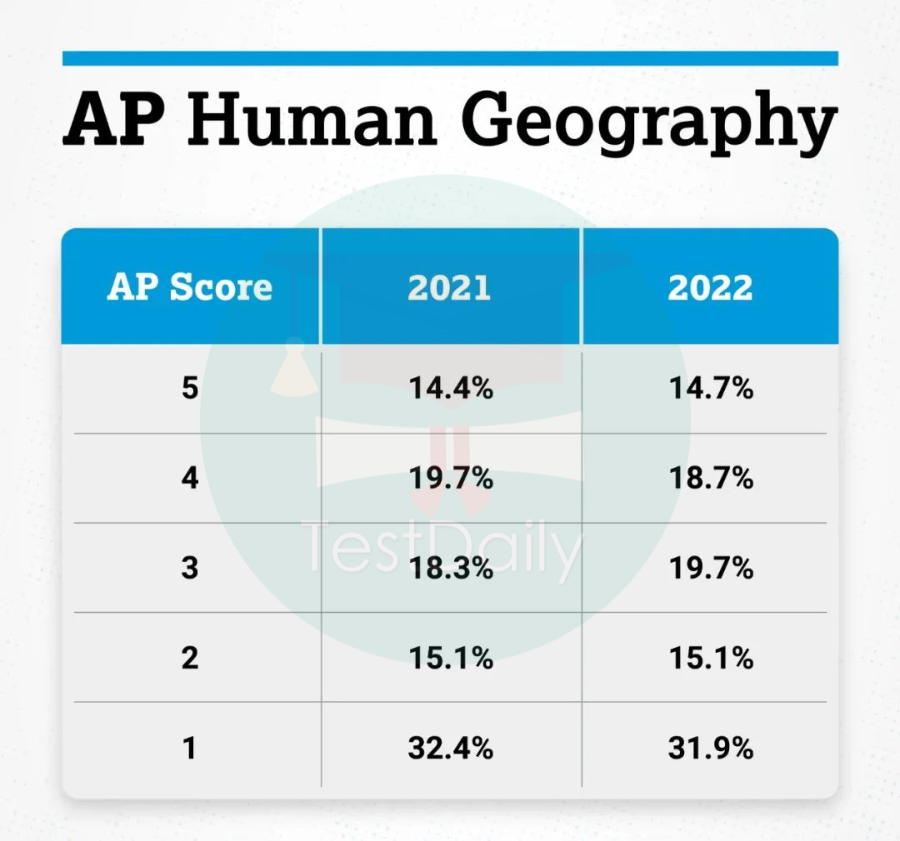 AP人文地理的5分率较2021年有小幅度增长,达到了14.7%。