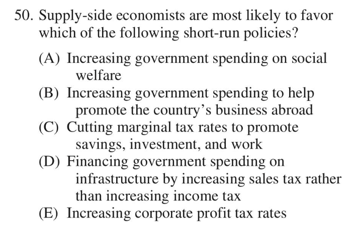 关于经济学学派的考点,在宏观经济中主要涉及的有凯恩斯主义(Keynesian),货币主义(monetarism),“看不见的手”(invisible hand theory)等。 这些较为零碎的考点很难作为单独的选择题进行考察,于是在AP宏观经济的考试中一般将它们与相关政策结合,作为选择题的细节考点,例如下面这题: