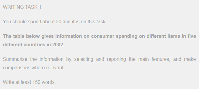 修改后:The table shows the percentage of money people in five countries spent on three categories of goods and services in the year 2002.