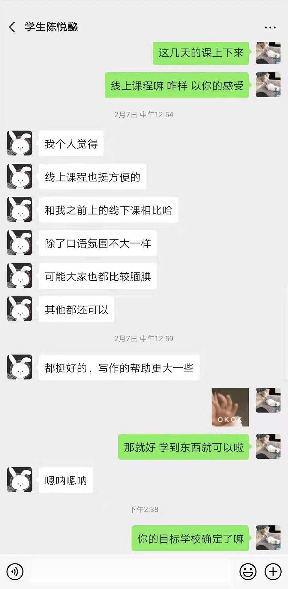 我是陈**,目前是南通大学大二在读,专业是国际经济与贸易。我的意向国家是英国,目标学校还没有确定好,还在纠结中。雅思成绩要求是各项小分不低于6分,总分6.5。我报的课程是10人精英6.5课程。2月底我结束了口写特训线上课程。