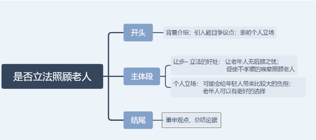 ➡️本题和传统常见的话题不同的点在于legally,因此要突出强调有必要立法强制年轻人去照顾,因此审题要注意围绕立法的角度展开。所以在这道题目中我们可以用如下结构展开: