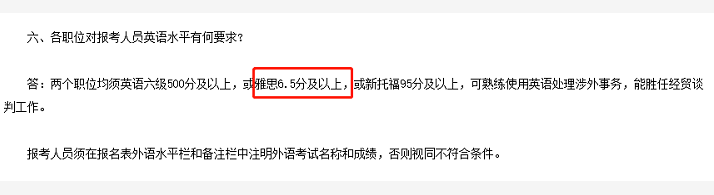 除此之外,在《2020年商务部公务员报考政策问答》中,也有明确提出对雅思成绩的具体要求。