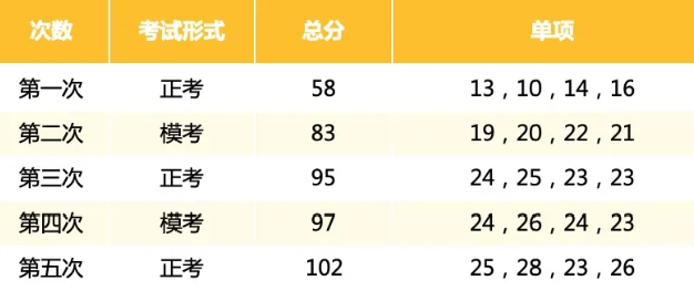 初见成果在技巧的训练上,我也遇到过很多瓶颈。也许在练习中总是看不到最满意的结果,但坚持下来,最后总能看到一些惊喜。当我上完一期班课以后,我参加了第一次模考,分数进步了25分,简直出乎我的意料,感觉四科都有突破,这跟我每天大量的背单词做精听精读密不可分。