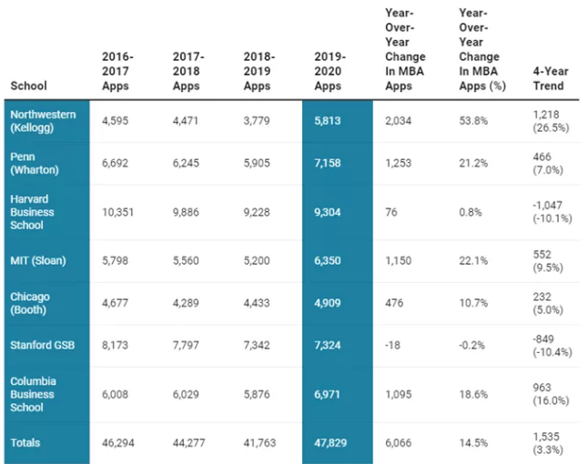 Poets&Quants此前报道5,商学院平均增加了22.6%的申请量,大幅扭转了两年前的低迷状态,比如西北大学凯洛格商学院的增幅为53.8%,麻省理工斯隆商学院增长了22.1%,沃顿增长了21.2%,哥伦比亚的增长率为18.6%,芝加哥布斯商学院增长了10.7%。